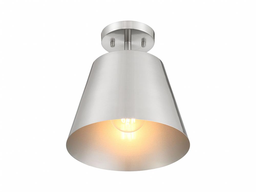 This sleek, chic 1-light ceiling semi-flush mount has a bold solid metal shade to concentrate and direct the light for a bright and dramatic glow. Its Brushed Nickel finish heightens the appeal. 11" height, 10" width, uses 1 standard size bulb of up to 60 watts. Bulb not included.