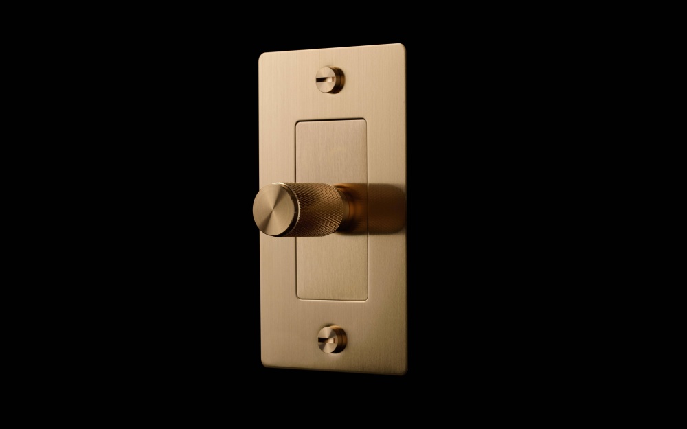 A dimmer switch finished in white. The dimmer knob features our signature, diamond-cut, cross knurl pattern and is made from solid white metal.