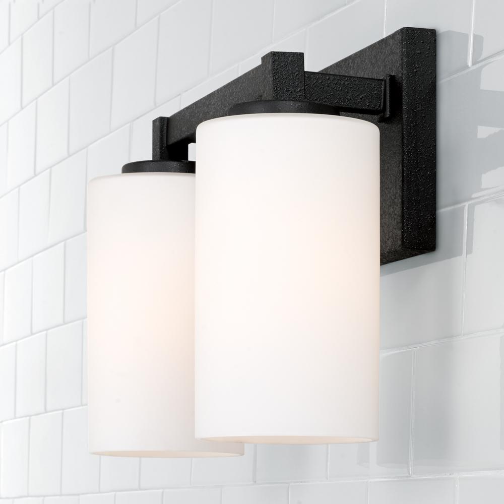 13.25"W x 9.5"H 2-Light Vanity in Black Iron with Soft White Glass