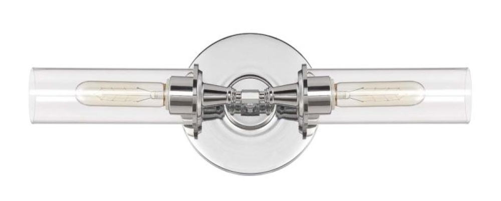 Two sleek clear glass cylinder shades combine with the classic round backplate of the Modina 2 light linear wall sconce to create this timeless favorite that can be mounted horizontally or vertically. Dimmable 6 Watt LED filament bulbs are included.