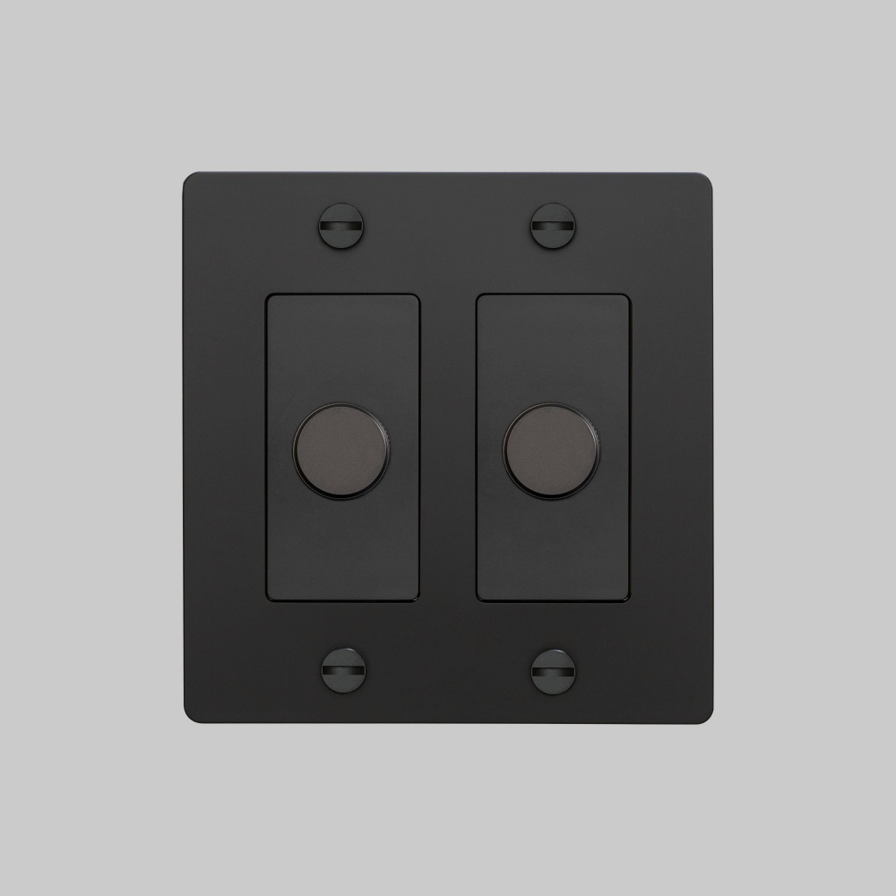 A dimmer switch finished in black. The dimmer knob features our signature, diamond-cut, cross knurl pattern and is made from solid black metal. FYI: This piece has a 4 mm shadow gap when installed.