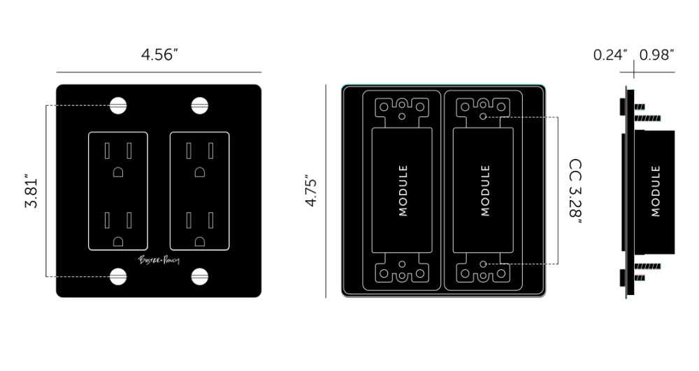 A duplex outlet featuring our signature coin screws and a flat plate made from solid metal in a black finish.