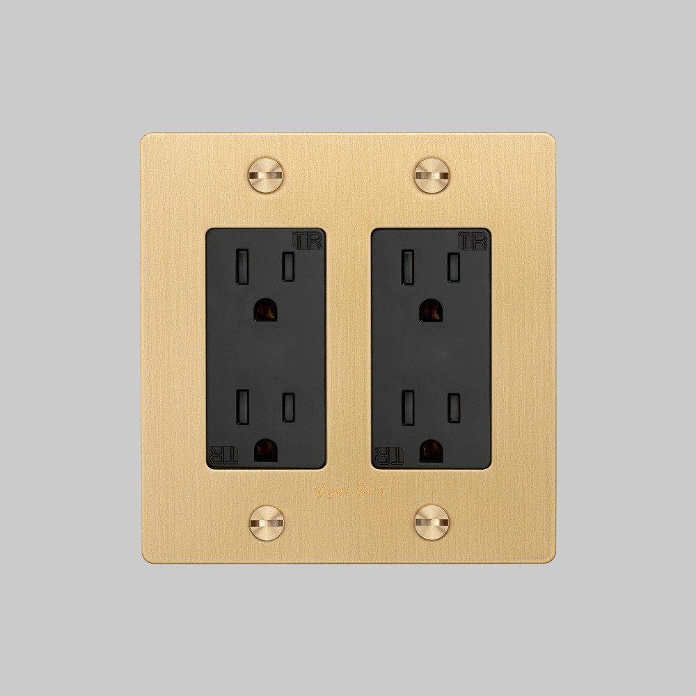 A duplex outlet finished in brass and featuring our solid brass coin screws.