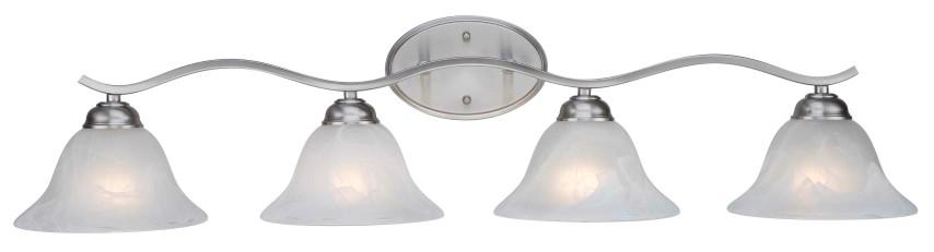 The Hollyslope 35" Vanity Bar is a decorative way to bring light into your bath or powder room. This Traditional fixture will complement a wide variety of decor and is easy to coordinate with your existing pieces. The Hollyslope 35" Vanity Bar features a horizontal curved arm that is attached to a centered oval wall plate, and holds four Marbleized Glass bell-shape shades. This fixture can be mounted with bulb facing up or down.