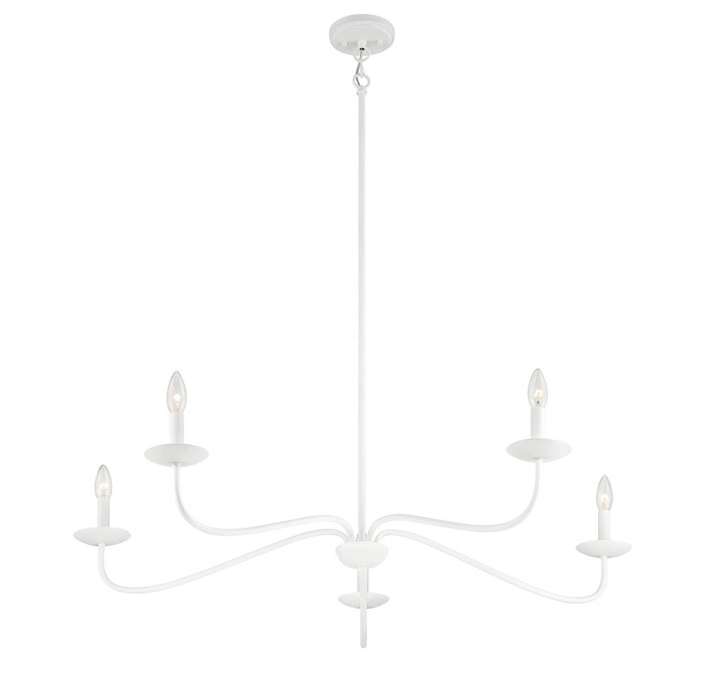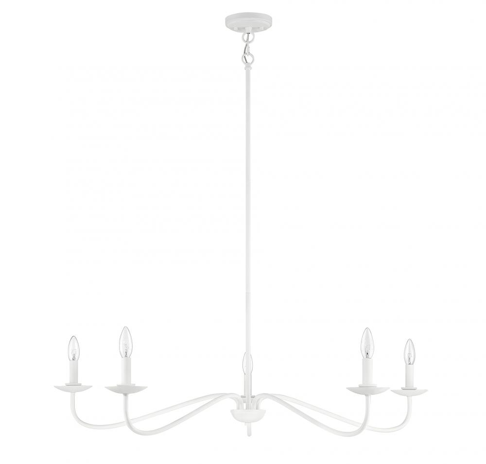 This 5-light chandelier makes a big statement with its long, dramatically curving arms and bisque white finish. Use it to add a fresh new look to rooms with traditional, contemporary and even farmhouse decor styles! 7" height, 42" width. Uses candelabra size bulbs, max 60 watts per bulb. LED bulb compatible.
