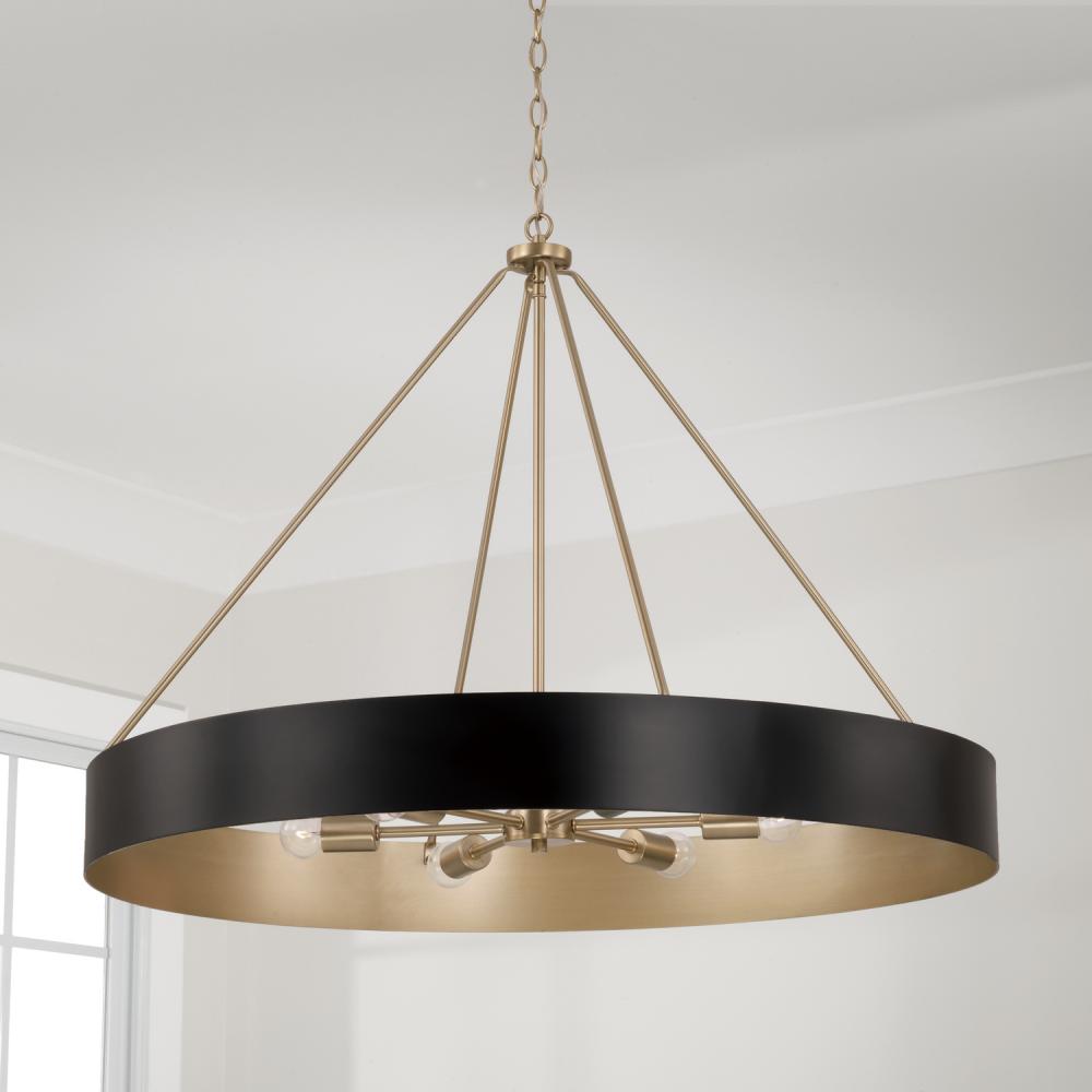 Contemporary style with classic appeal. The Weller 6-Light Chandelier combines an elegant, circular silhouette with angled lines for a sleek aesthetic. The Matte Black finish with painted Matte Brass interior brings mixed metal intrigue and a hint of shine.