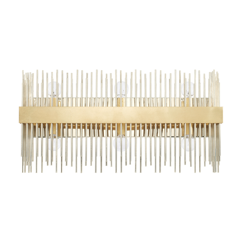 The gorgeous Lena 6-light vanity fixture in Fire and Ice finish boasts style that wakes up your bath! Featuring a cluster of slender rods enveloped by a band, this bath light offers an interplay of Polished Nickel and Capital Gold finishes for a dramatic, glam update. Try this vanity light paired with a mirror in either a gold or chrome frame for a cohesive look, or black frame for a hint of Hollywood Regency inspired style.