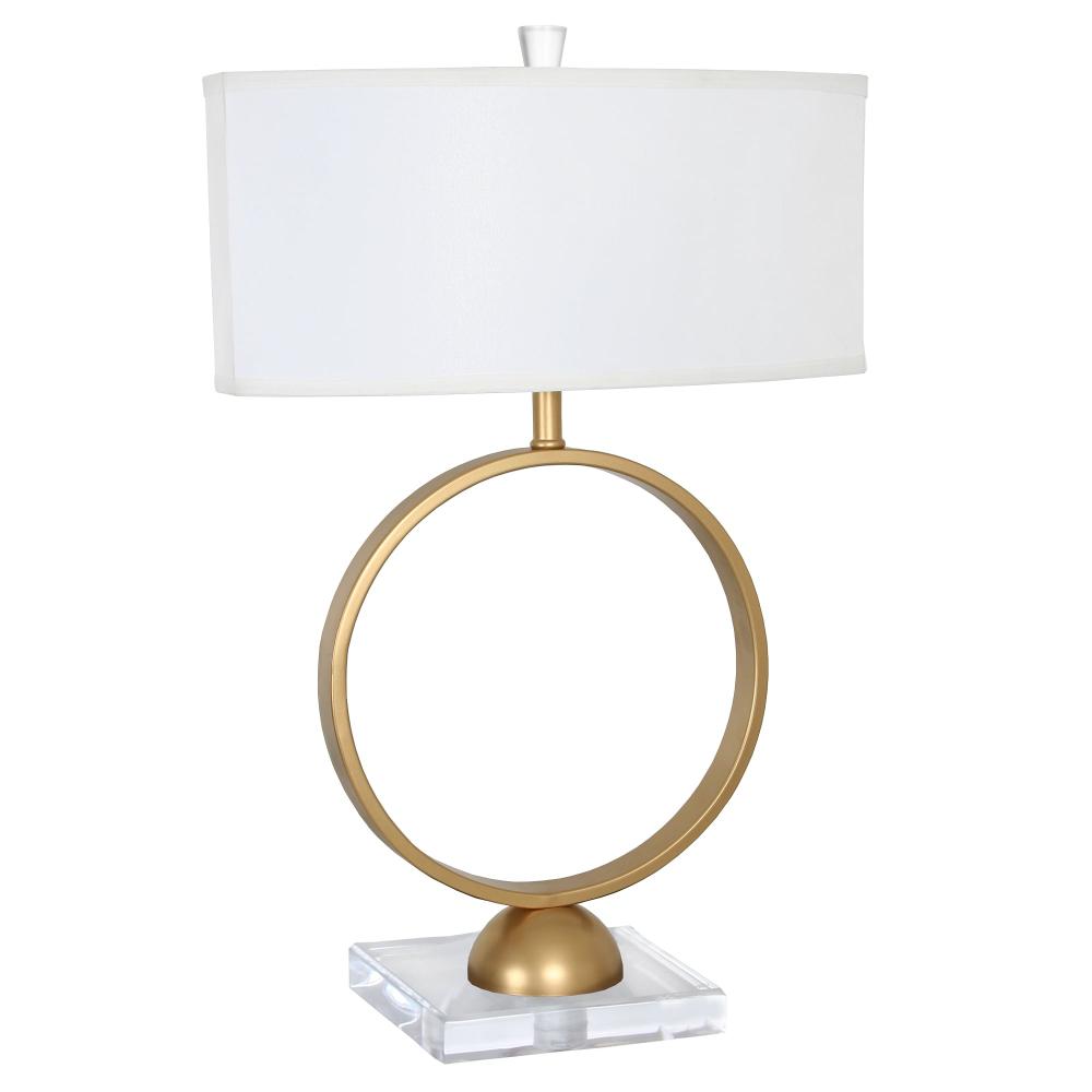 A squared, crystal-clear base of acrylic and matching finial enhance the open, airy look of the Van Teal Carmel Table Lamp. This sophisticated table lamp features a sleek metal, circular frame in gleaming gold that's capped with a crisp white linen shade, lending everyday elegance to your décor. Comes with a 1-year manufacturer's limited warranty.