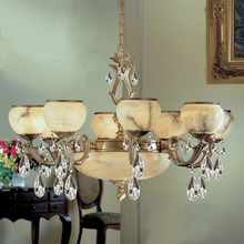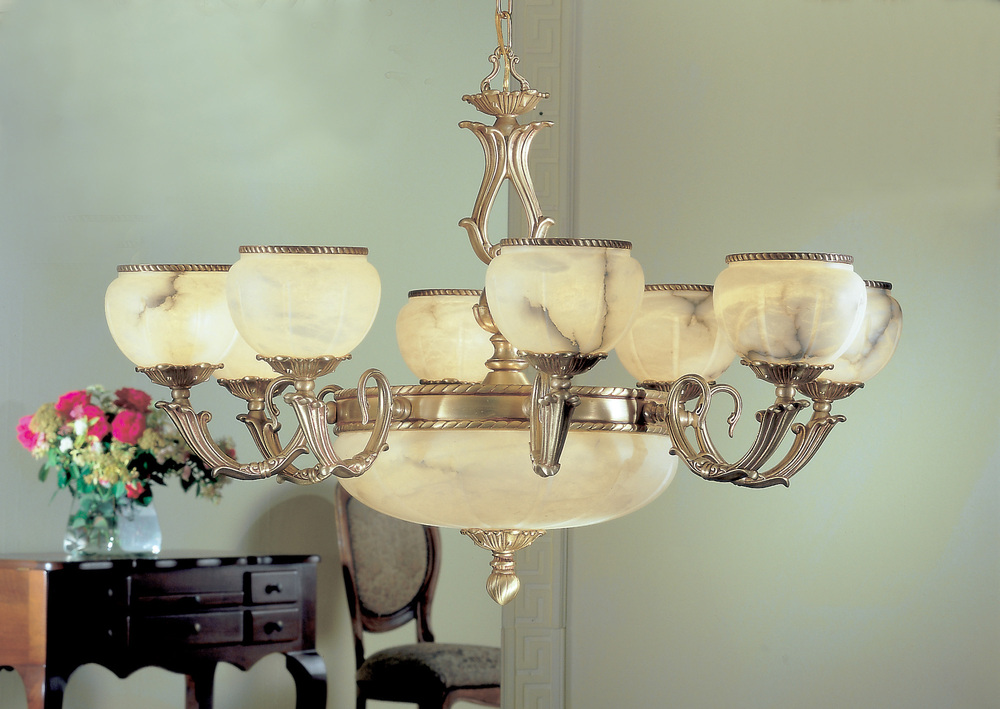 Alexandria I 36"Wide x 36"Long x 25"High Lights: 12 x 60W candelabra Finish Shown: Satin Bronze w/Brown Patina Crystal Shown: n/a Chain or Cable Length: 6 Ship Via: TRUCK Shipping Weight: 61 Hanging Weight: 43 Catalog/Page Ref: 5005/209 Solid bronze cast frames with authentic hand-carved alabaster. Exquisite styling, exclusive designs, heavy cast metalwork at unbelievably affordable cost.
