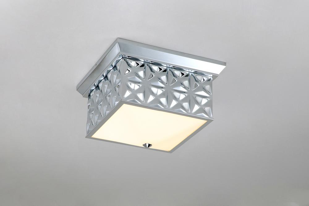 Reflect elegance with this 14.5" square polished chrome flush mount. Sleek design shines bright. Damp-rated, with creamy white glass for a crisp, flattering glow.