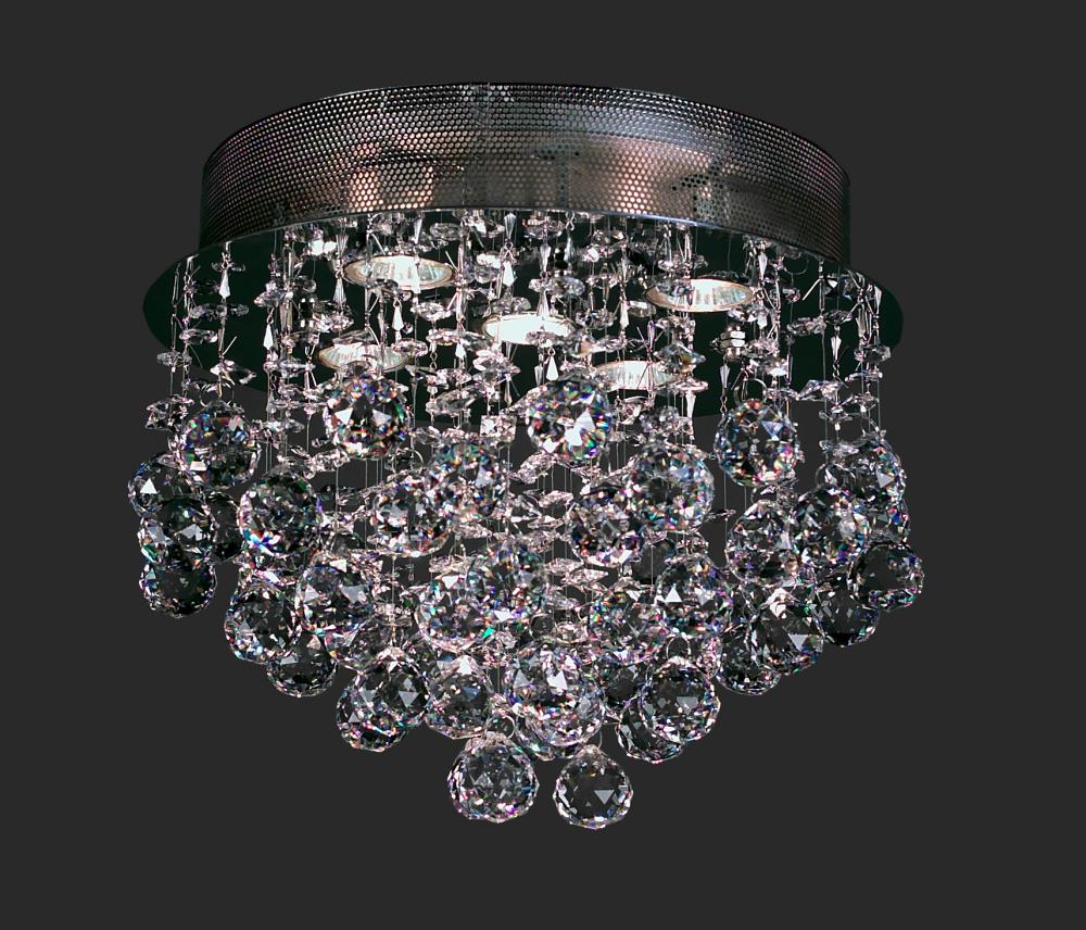 Andromeda 15"Wide x 15"Long x 12"High Lights: 5 x 50W GU10 Finish Shown: Chrome Crystal Shown: Crystalique-Plus Chain or Cable Length: n/a (Ceiling Flush Mount) Ship Via: Parcel Shipping Weight: 28 Hanging Weight: 25 Catalog/Page Ref: 5410/26 The Andromeda series has a contemporary styling with multi-layered faceted lead crystal balls that sparkle under the pure white light of the halogen bulbs.