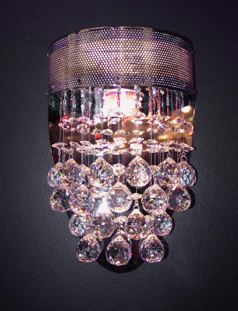 Andromeda 8"Wide x 12"High x 4"Deep Lights: 1 x 50W GU10 Finish Shown: Chrome Crystal Shown: Crystalique-Plus Chain or Cable Length: n/a (Wall Mount) Ship Via: Parcel Shipping Weight: 6 Hanging Weight: 5 Catalog/Page Ref: 5410/26 The Andromeda series has a contemporary styling with multi-layered faceted lead crystal balls that sparkle under the pure white light of the halogen bulbs.