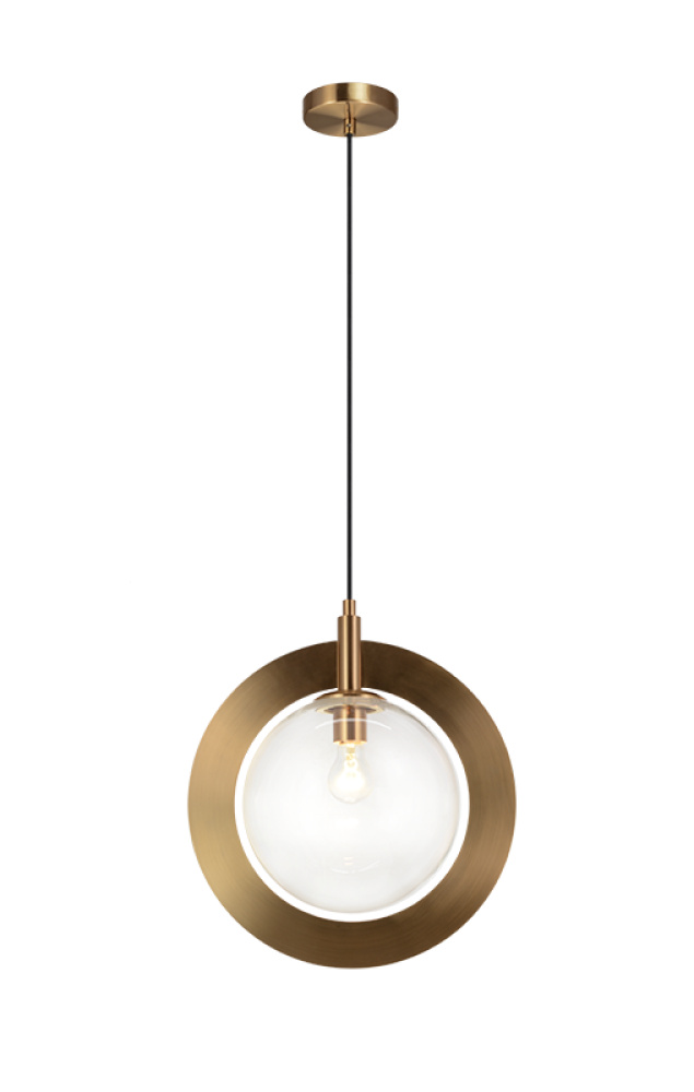 A stunning yet simple pendant designed with circular elements. Astro features Clear or Opal Glass, surrounded by a bold metal ring. Available in 2 finishes: Aged Gold Brass and Black.