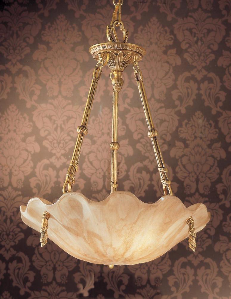 Atlantis 18"Wide x 18"Long x 24"High Lights: 3 x 40W candelabra Finish Shown: Honey Bronze Crystal Shown: n/a Chain or Cable Length: 3 Ship Via: Parcel Shipping Weight: 23 Hanging Weight: 20 Catalog/Page Ref: 4601/14 Spanish made sold brass cast frames with lightly antiqued genuine alabaster stone shades carved into a scallop shell pattern.