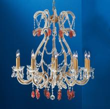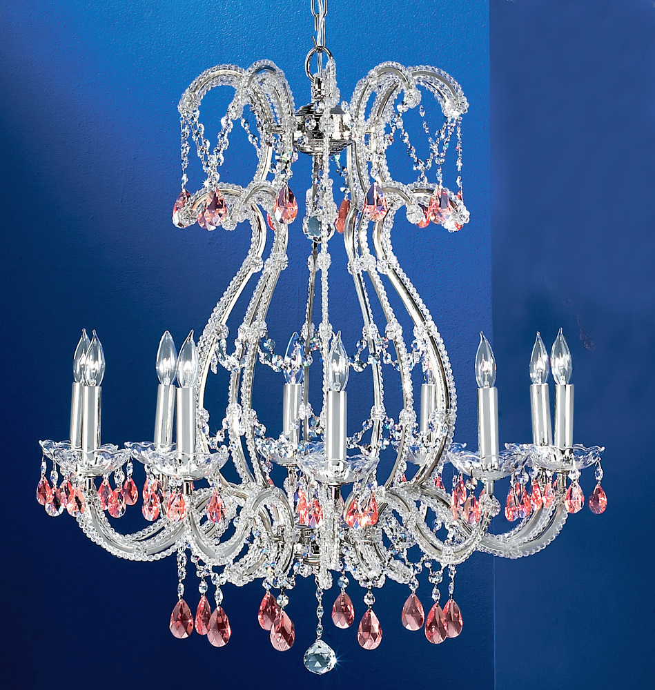 Aurora 28"Wide x 28"Long x 31"High Lights: 10 x 60W candelabra Finish Shown: Chrome Crystal Shown: Prisms Rose Chain or Cable Length: 3 Ship Via: Parcel Shipping Weight: 35 Hanging Weight: 30 Catalog/Page Ref: 5005/151 Delicate chrome or olde gold iron frames cleverly adorned with strands of multi-faceted beads, then lightly accented with color grape clusters, clear almond prisms, or colored almond prisms.