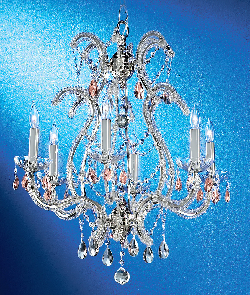 Aurora 24"Wide x 24"Long x 26"High Lights: 6 x 60W candelabra Finish Shown: Chrome Crystal Shown: Prisms Amethyst Chain or Cable Length: 3 Ship Via: Parcel Shipping Weight: 22 Hanging Weight: 18 Catalog/Page Ref: 5005/151 Delicate chrome or olde gold iron frames cleverly adorned with strands of multi-faceted beads, then lightly accented with color grape clusters, clear almond prisms, or colored almond prisms.