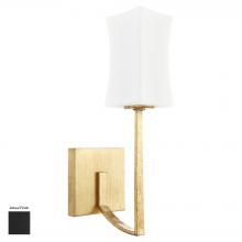 The Ayala series of chandeliers, wall mounts and sconces boasts clean lines and soft curves contrasted by right angles. The sconce's slim backplate supports a rectangular prism that supports two satin opal glass shades with a slightly flared design at the top and bottom, housing a candelabra socket. Choose from matte black or gold leaf finishes.