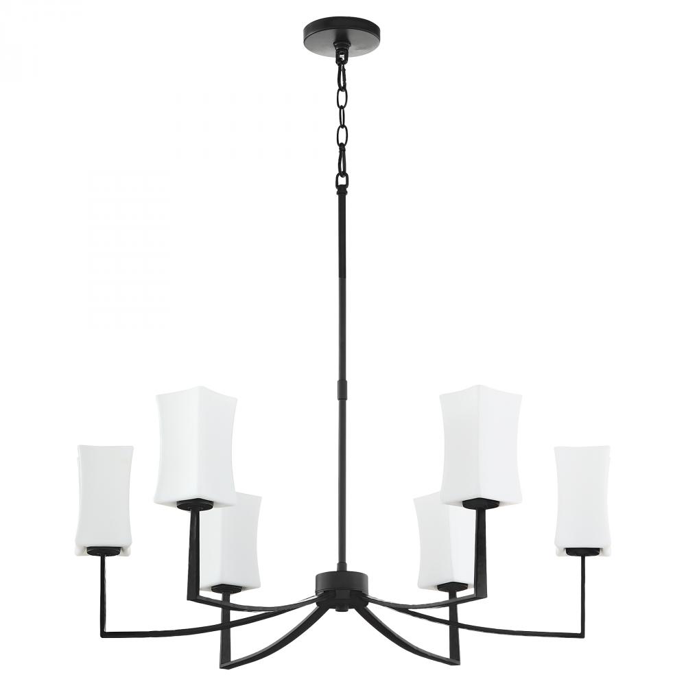 The Ayala series of chandeliers, wall mounts and sconces boasts clean lines and soft curves contrasted by right angles. The chandelier's slender stem extends down to a central cylindrical hub. From this hub, six arms extend outwards and slightly upwards in a symmetrical arrangement. Each arm supports a rectangular satin opal glass shade with a slightly flared design at the top, housing a candelabra socket. Choose from matte black or gold leaf finishes.