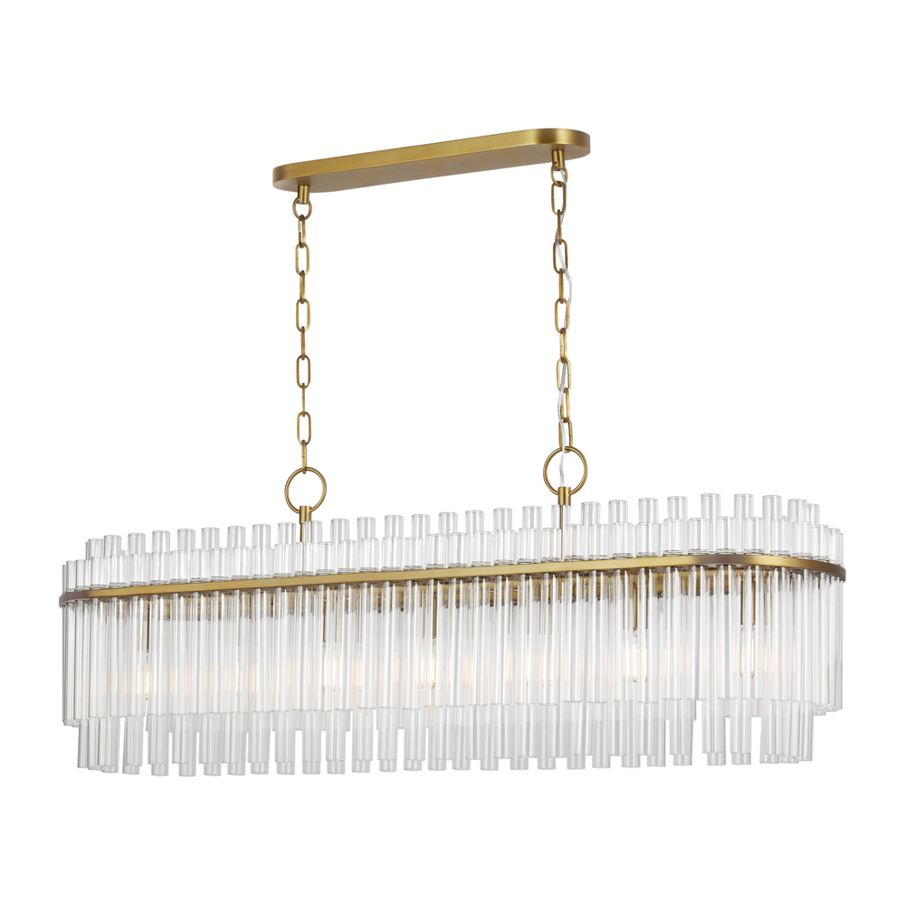 The Beckett family from Chapman & Myers presents Art Deco forms with a modern minimalist sensibility. Crafted of steel, a round metal band holds the clear extruded glass cylinders in place. The Beckett twelve light single-tier chandelier in burnished brass is the perfect way to achieve your home's desired fashion or functional needs.