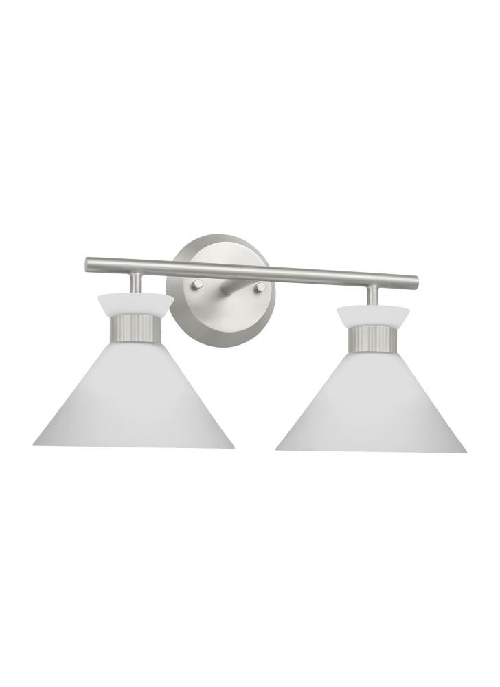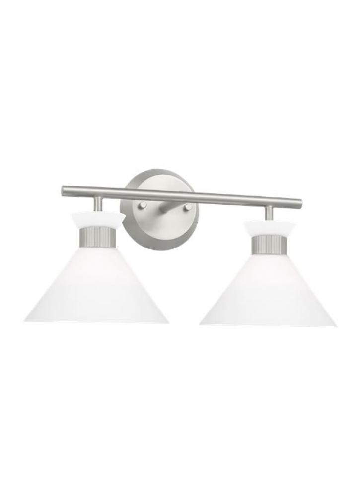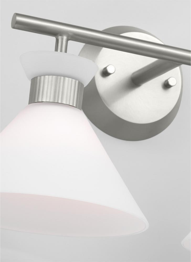 Inspired by playful mid-century modern design, the Drew & Jonathan Belcarra Two Light Wall / Bath Sconce is accentuated by a flared glass shade with ribbed metal details and etched white glass that bestows an almost whimsical touch to the clean design. Available in three finishes, Brushed Steel, Midnight Black, and Satin Brass, the Belcarra looks great on its own or installed above a bathroom vanity. This fixture may be mounted in the up or down position, and is cETL listed for damp locations, making it the perfect lighting solution for any space.