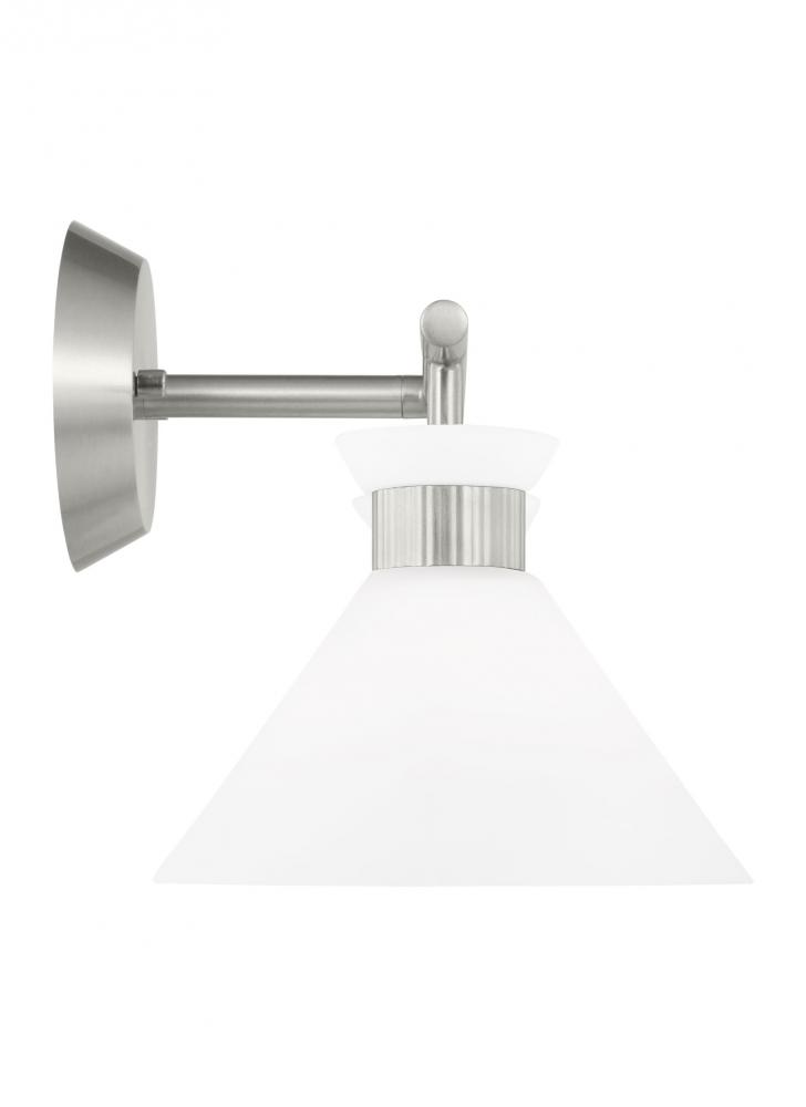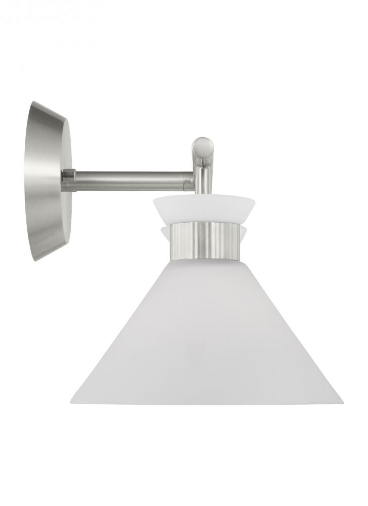 The flared glass shade with ribbed metal details and etched white glass of this light bring clean lines and classic mid-century modern design to any wall or bath space