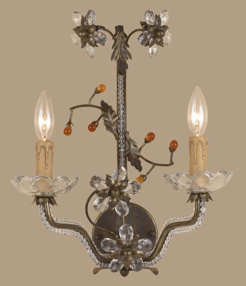 Bella Uva 13"Wide x 17"High x 9"Deep Lights: 2 x 60W candelabra Finish Shown: English Bronze w/Gold Crystal Shown: Crystalique-Plus Chain or Cable Length: n/a Ship Via: Parcel Shipping Weight: 5 Hanging Weight: 2 Catalog/Page Ref: 5106/24 Handcrafted vines, leaves, amber grapes, and shimmering 30% lead crystal beads is sure to please designers looking for natural elegance and ambiance.
