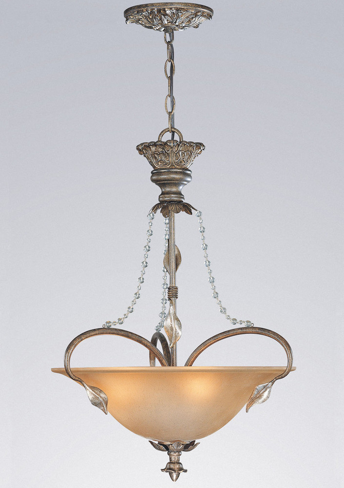 Belleair 20"Wide x 20"Long x 26"High Lights: 3 x 60W standard Finish Shown: Bronze w/Silver Highlights Crystal Shown: n/a Chain or Cable Length: 3 Ship Via: Parcel Shipping Weight: 18 Hanging Weight: 16 Catalog/Page Ref: 5106/26 The play of light through the strands of clear glass beads evoke images of dew drops on the hand forged leaves and vines that adorn these wrought iron frames. A soft glow from the tea stained glass shades provides a warm effect with the natural bronze framework. Although the tapered branches, forged leaves and delicate hand painted finish portend an inordinate level of craftsmanship, these fixtures are within nearly anyones budget.