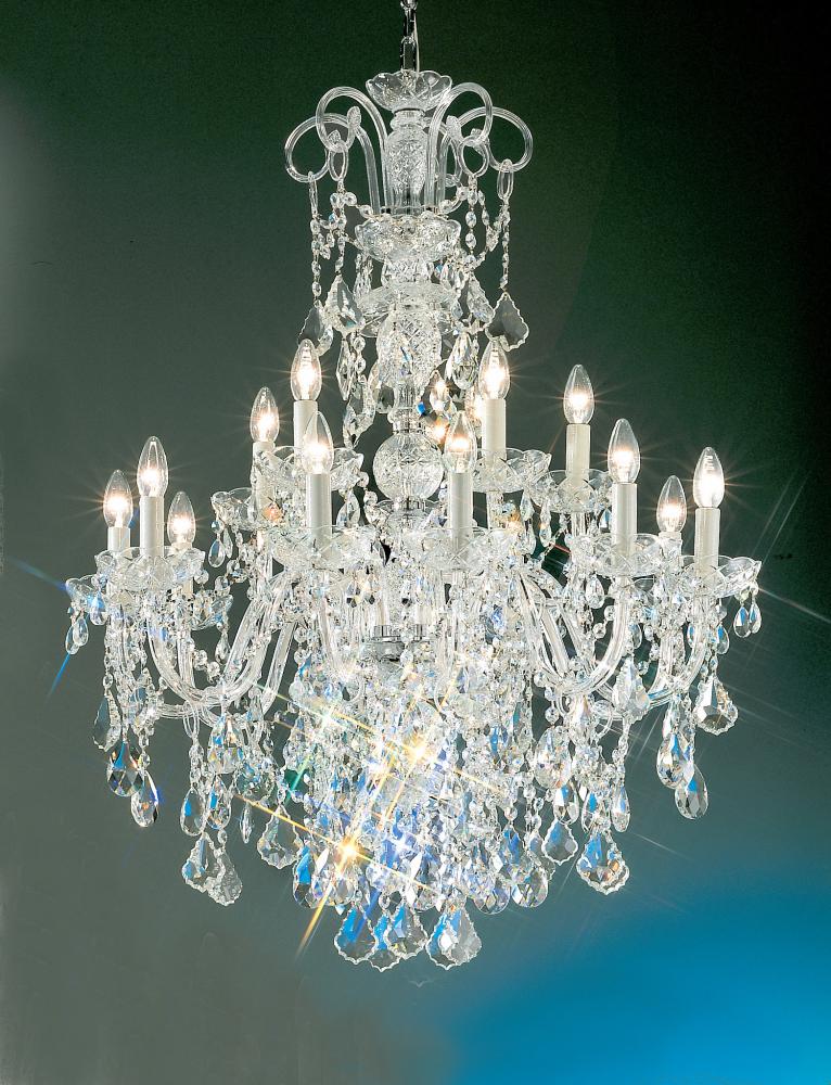 Bohemia 32"Wide x 32"Long x 42"High Lights: 15 x 60W candelabra Finish Shown: Chrome Crystal Shown: Crystalique Chain or Cable Length: 6 Ship Via: TRUCK Shipping Weight: 70 Hanging Weight: 49 Catalog/Page Ref: 5005/13 European made, with all nickel plated metal parts and matching nickel crystal connectors, these chandeliers give the illusion of being held together only by crystal without a metal frame.