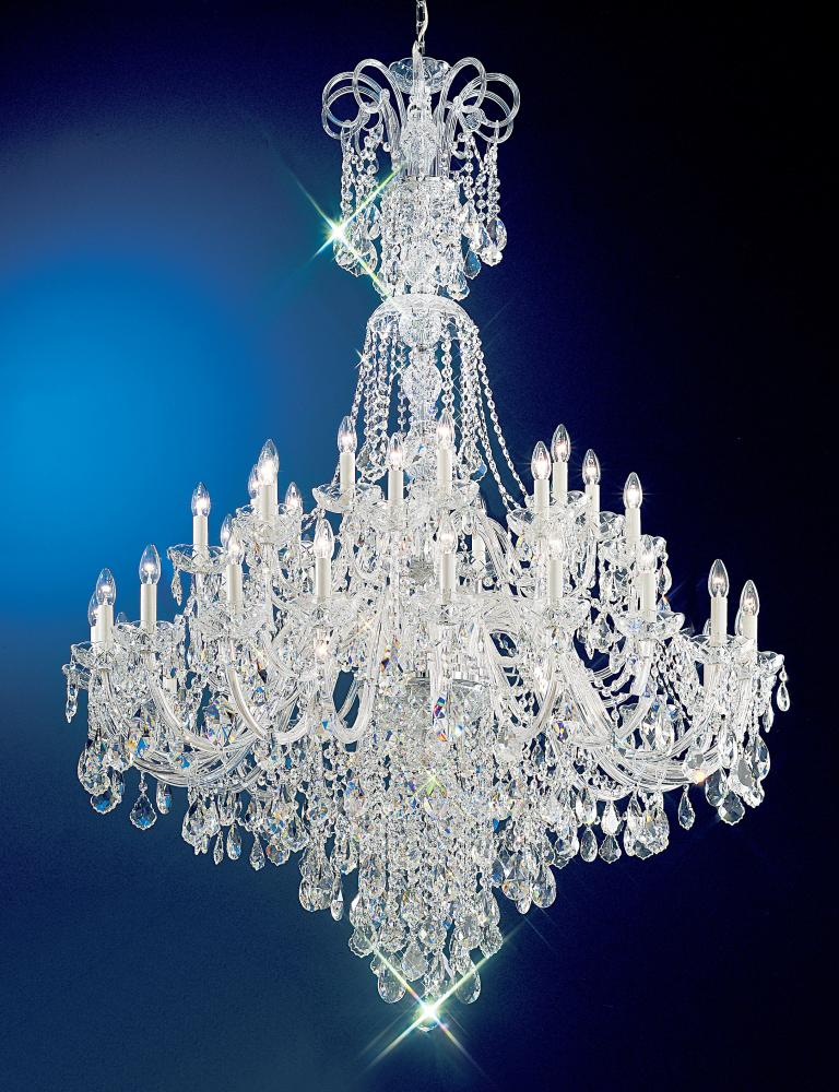 Bohemia 60"Wide x 60"Long x 72"High Lights: 40 x 40W candelabra Finish Shown: Chrome Crystal Shown: Crystalique Chain or Cable Length: 6 Ship Via: TRUCK Shipping Weight: 204 Hanging Weight: 170 Catalog/Page Ref: 5005/12 European made, with all nickel plated metal parts and matching nickel crystal connectors, these chandeliers give the illusion of being held together only by crystal without a metal frame.