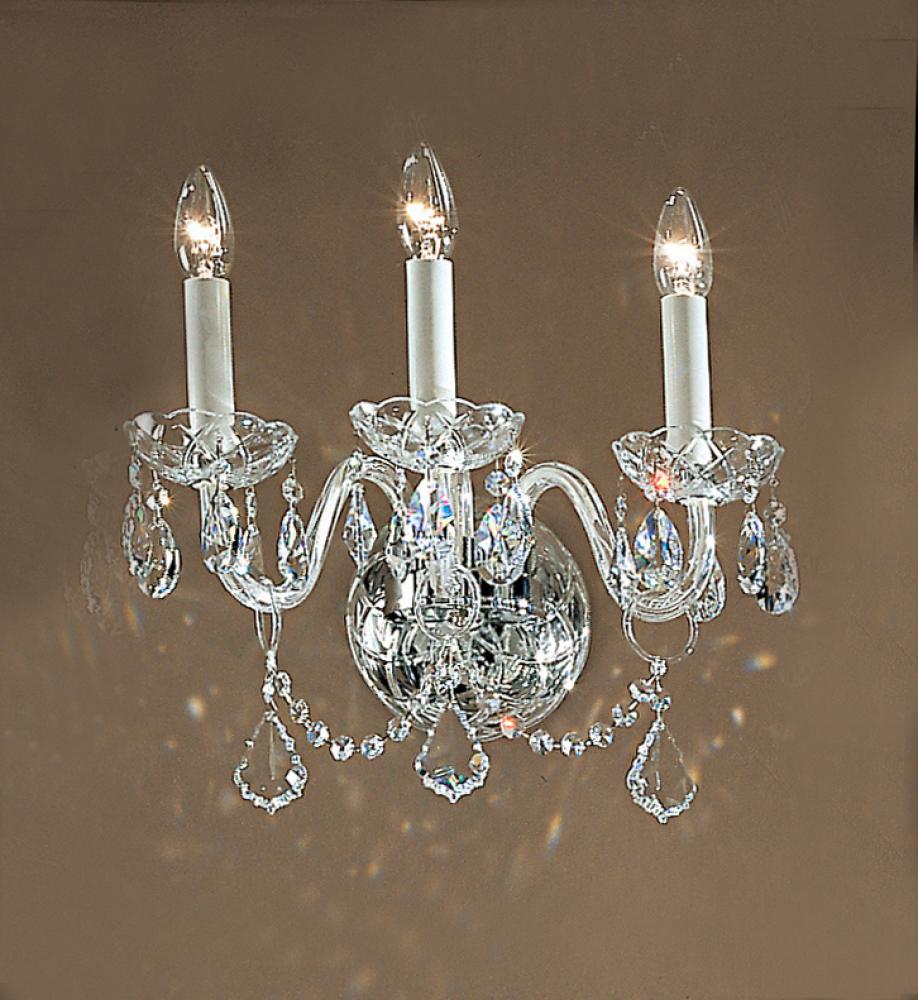 Bohemia 15"Wide x 14"High x 10"Deep Lights: 3 x 60W candelabra Finish Shown: Chrome Crystal Shown: Crystalique Chain or Cable Length: 3 Ship Via: Parcel Shipping Weight: 10 Hanging Weight: 7 Catalog/Page Ref: 5005/15 European made, with all nickel plated metal parts and matching nickel crystal connectors, these chandeliers give the illusion of being held together only by crystal without a metal frame.