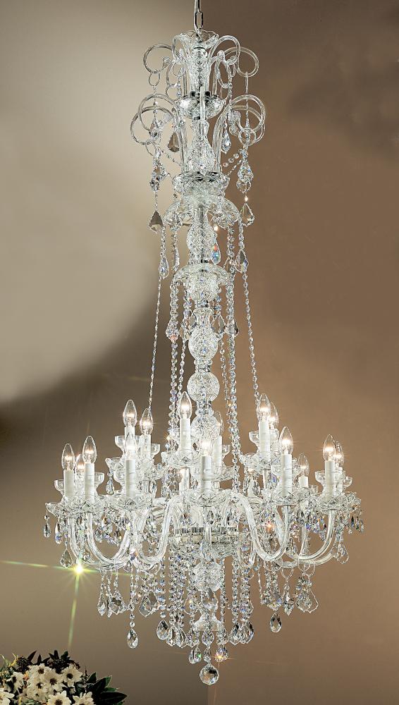 Bohemia 32"Wide x 32"Long x 65"High Lights: 18 x 60W candelabra Finish Shown: Chrome Crystal Shown: Crystalique Chain or Cable Length: 6 Ship Via: TRUCK Shipping Weight: 70 Hanging Weight: 48 Catalog/Page Ref: 5005/15 European made, with all nickel plated metal parts and matching nickel crystal connectors, these chandeliers give the illusion of being held together only by crystal without a metal frame.
