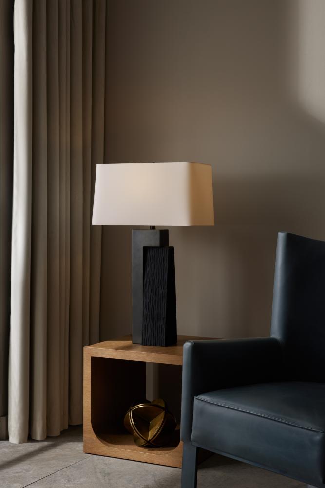 Powerful shapes of charcoal ricestone composite and English bronze-finished steel converge to create a contemporary sculpture for your home. Accented with a rectangular drum shade of off-white microfiber lined in cotton, its masculine lines enervate any surface. Topped with an English bronze finial and finished with a black cloth cord. Three-way rotary switch.