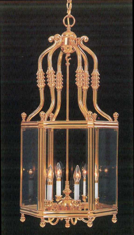 Burlington 18"Wide x 18"Long x 41"High Lights: 6 x 60W candelabra Finish Shown: Polished Brass Crystal Shown: n/a Chain or Cable Length: 3 Ship Via: Parcel Shipping Weight: 38 Hanging Weight: 30 Catalog/Page Ref: 3996/31 Cast solid brass lanterns.