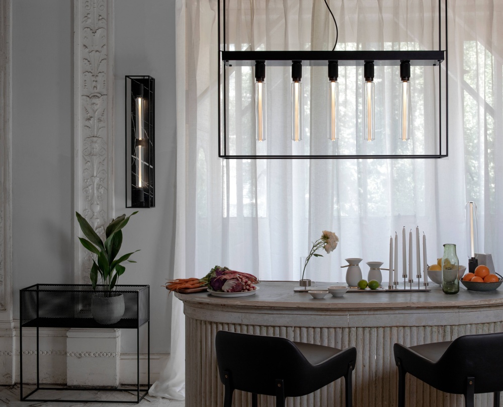 A ceiling light made from a matt black metal cage and comes with a polished BLACK MARBLE back panel. The ceiling light is finished with matt black, cross knurled, lamp holders and our signature coin screws.