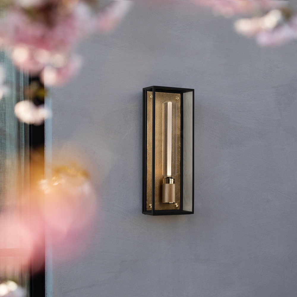 A wall light made from a matt black metal and glass cage, complete with a sand cast metal back panel. It features a solid metal, cross knurled, lampholder with our signature coin screws. IP44 rated and ADA compliant, suitable for wet locations*, bathroom and outside use. Available in Steel, Brass, Gun metal, Black + Steel, Black + Brass and Black + Gun Metal finishes. Protected against water splashed from all directions, with limited ingress. In some cases, moisture may get into the cage but will evaporate after a short time through drainage holes.