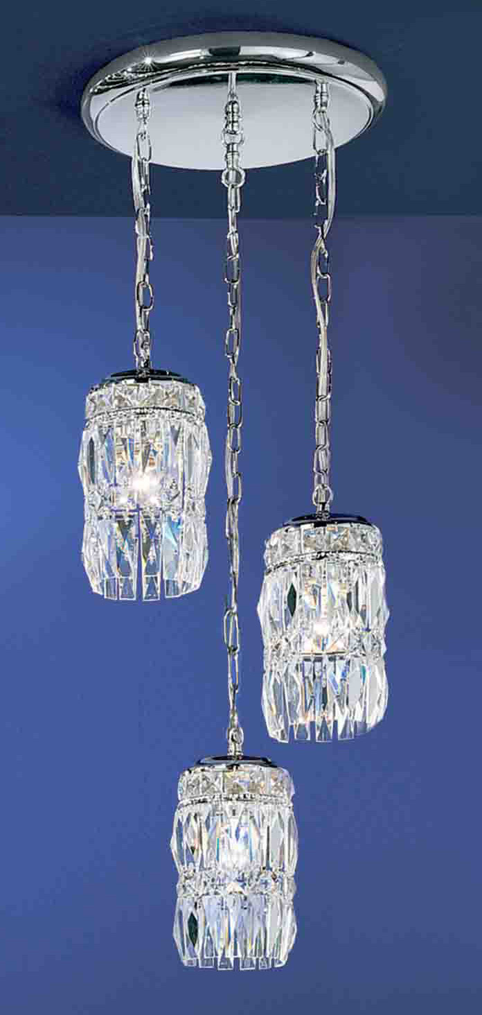 Cascade 10"Wide x 10"Long x 16-72"High Lights: 3 x 60W standard Finish Shown: Chrome Crystal Shown: Crystalique-Plus Chain or Cable Length: 6 Ship Via: Parcel Shipping Weight: 10 Hanging Weight: 8 Catalog/Page Ref: 5410/58 Options abound with this transitional family of crystal chandelier! Mix chrome frames with clear crystal for a more contemporary look or English bronze with gold highlights and amber crystal for a more traditional look. Mini pendants in antique white with rose crystal are perfect for the little Princess room. Mini pendants in English bronze with amber crystals sets the mood over a bar. Dark corners or staircase landings come alive with a 3 light cluster. Use your imagination.