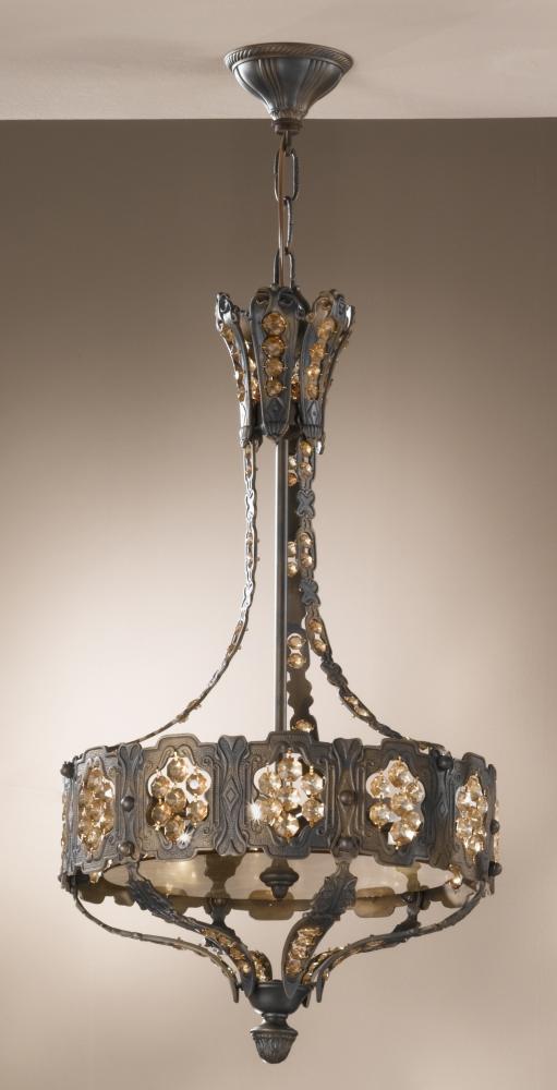 Castillio de Bronce 16"Wide x 16"Long x 29"High Lights: 3 x 60W candelabra Finish Shown: Aged Bronze Crystal Shown: Antique Italian Chain or Cable Length: 3 Ship Via: Parcel Shipping Weight: 49 Hanging Weight: 30 Catalog/Page Ref: 5207/38 The Castillo de Bronce is a very rich, solid cast brass fixture finished in an oxidized Aged Bronze finish. The exquisite detail of the Olde World castings is complimented by the warm glow of the Antique Italian crystal encrusted in the cast bandings. The interior lights are softened by a glass diffuser plate finished in the same Antique Italian finish found on the crystal. The baked on finish is very durable, but as with all finer finishes no cleaning chemicals should be used, just a damp cloth is best. These European-made fixtures can help tern your home into a castle.