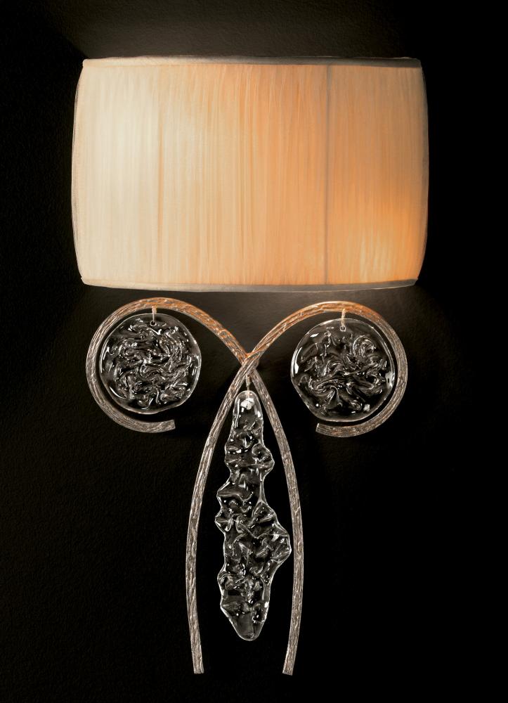 Celeste 14"Wide x 26"High x 8"Deep Lights: 2 x 40W G9 Finish Shown: Silver Frost Crystal Shown: n/a Chain or Cable Length: n/a Ship Via: Parcel Shipping Weight: 20 Hanging Weight: 15 Catalog/Page Ref: 5410/32 The Celeste Series could truly be considered artwork first, lighting second. The solid brass, textured banding is bent and shaped to form fluid, swirling lines that embrace the hand-made Italian glass disks which also have a texture that evoke the feeling of ice that has partially thawed and re-froze to create an undulating surface that makes the light dance as it passes through.