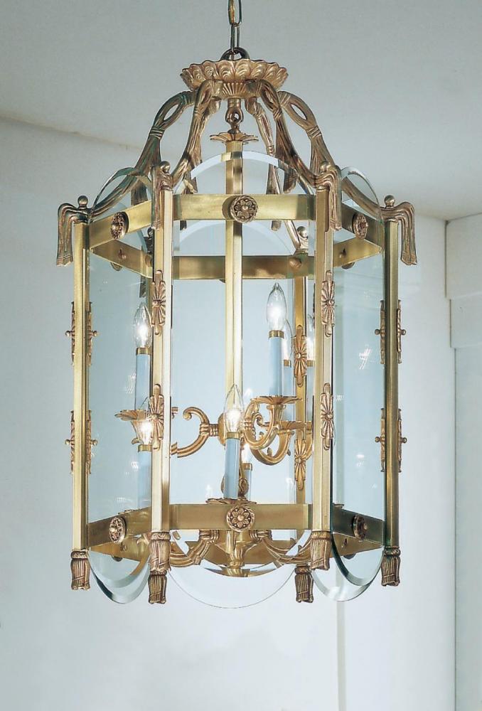 Charleston 22"Wide x 22"Long x 33"High Lights: 9 x 60W candelabra Finish Shown: Satin Bronze w/Brown Patina Crystal Shown: n/a Chain or Cable Length: 3 Ship Via: Parcel Shipping Weight: 118 Hanging Weight: 80 Catalog/Page Ref: 4601/42 Cast solid brass lanterns.