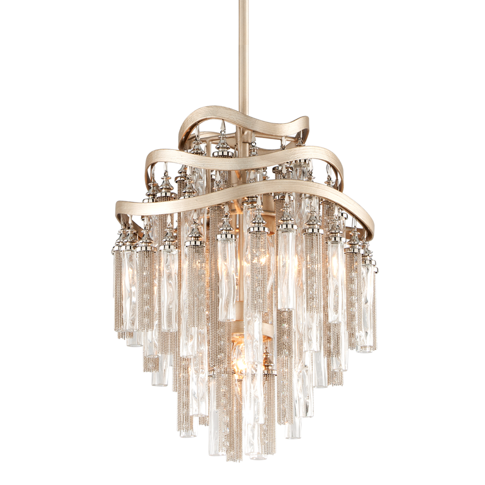 Chimera from Corbett Lighting is a study in dynamic shape and kinetic energy. Featuring shimmering nickel and crystal tassels and clear tubular glass, the fixture is supported by a hand-crafted frame finished in an attractive Tranquility silver leaf finish.