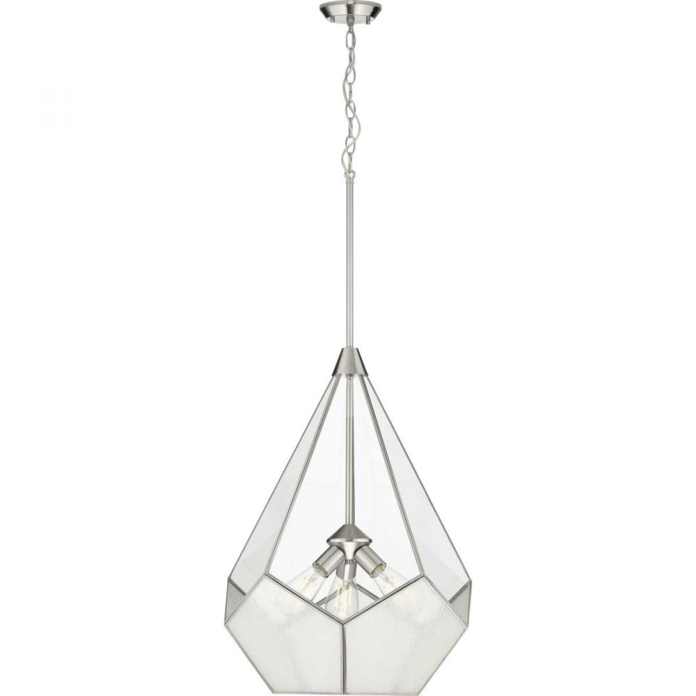 Glass panels create a shade that holds an industrial light base inside.;Geometric shapes form from the brushed nickel frame.;Inspired by modern geometric designs and contrasting elements, this bohemian-style pendant is an attention-grabber for all the righ