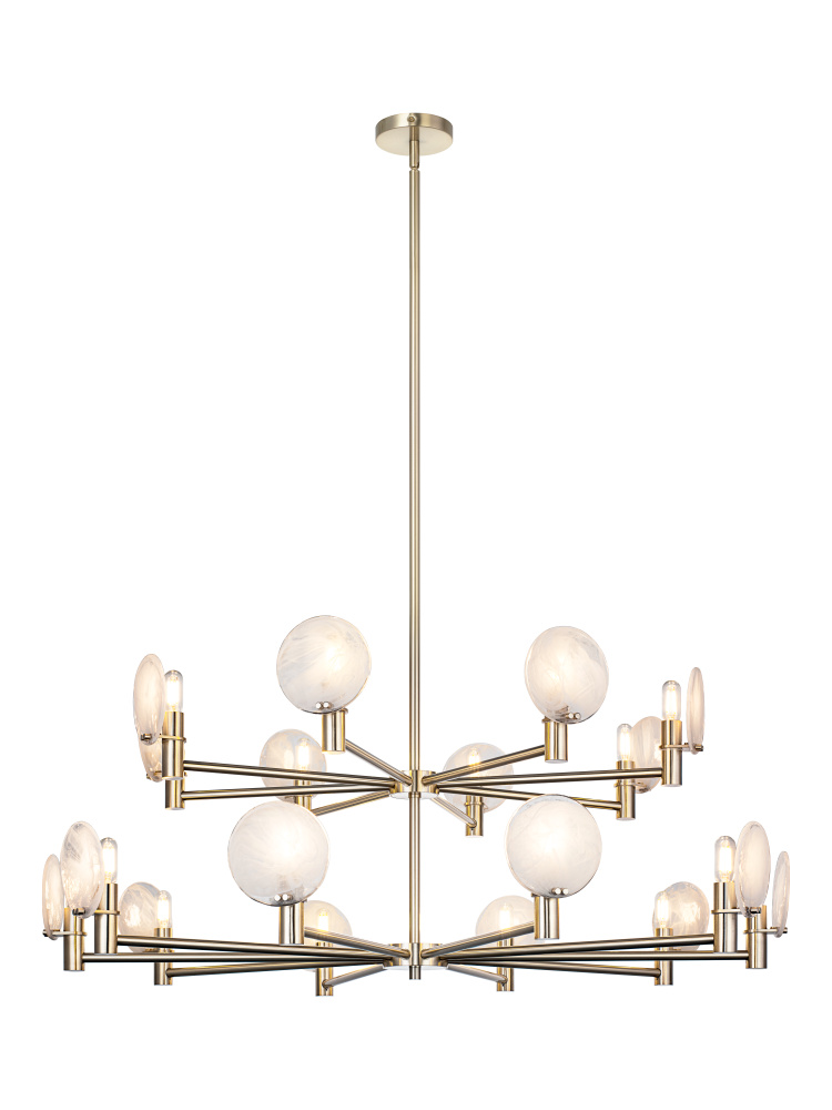 This chandelier blends mid-century modern with space-age sophistication ideal for upscale dining rooms, creative studios, or hospitality spaces aiming for an artistic edge.This can be shown with the light emitting up or down.The cloudy swirl glass gives it a soft touch to the design.