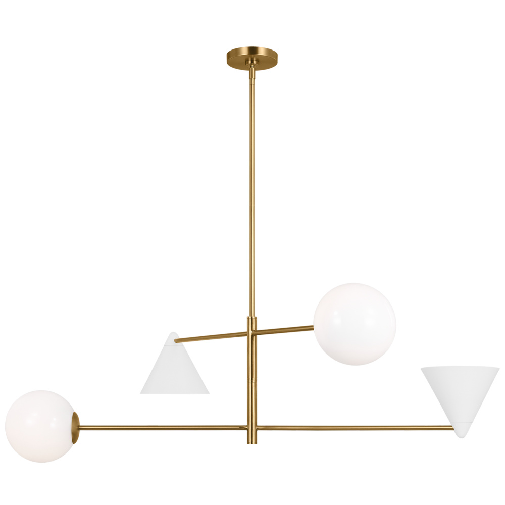 The Cosmo series by AERIN for Visual Comfort Studio Collection plays with asymmetry, combining milk glass globes that emit a soft glow, and metal cone shades, which focus light above and below.