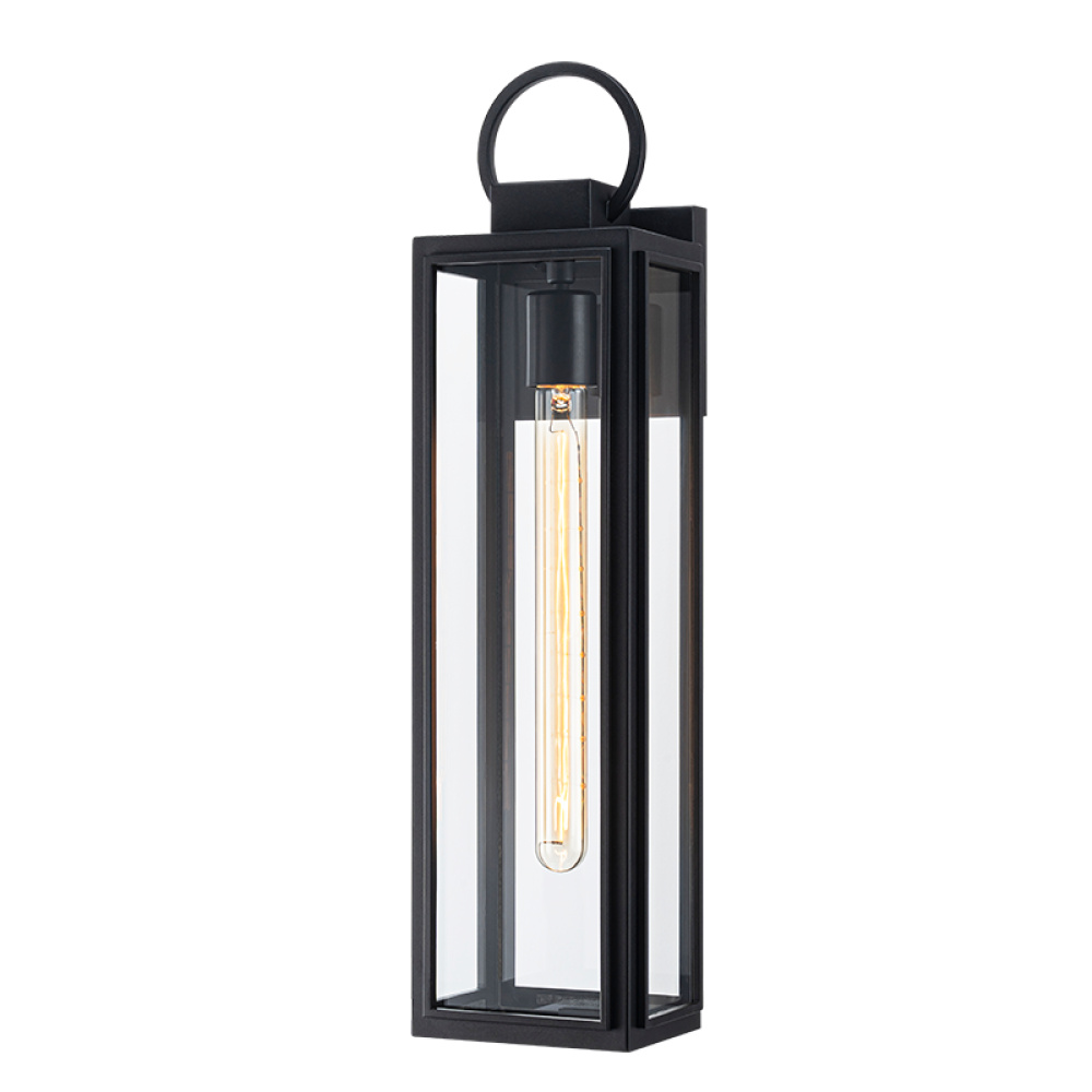 This exterior wall light features a rectangular design with a sturdy Matte Black metal frame and clear glass panels, allowing the bulb to be fully visible. The clear glass gives it a clean, modern look while its classic lantern shape adds a touch of elegance while still being suitable for contemporary settings. The clear glass and open design work well to showcase decorative filament bulbs, adding warmth and character to the light.