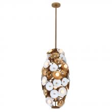 Insipired by a floral bouquet, the Damask collection features stamped steel flowers that create a swirl textured design. Soft white globes randomly sit to illuminate the outside while additional bulbs glow from behind to create a n even light. Available in Matte Black and Gold or Matte White and Gold finishes