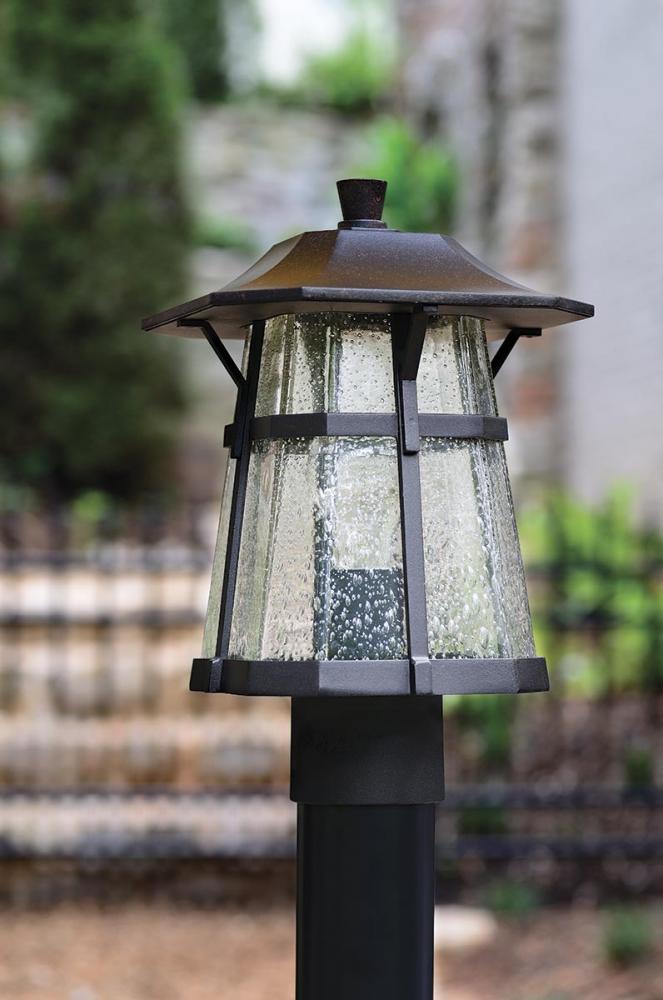 Antique Bronze finish.;Marriage of traditional and rustic styling.;Artistic glass.;Meets California Title 24 high efficacy requirements for outdoor use only.;623 lumens 69.2 lumens/watt per module (source);3000K color temperature, 90+ CRI.