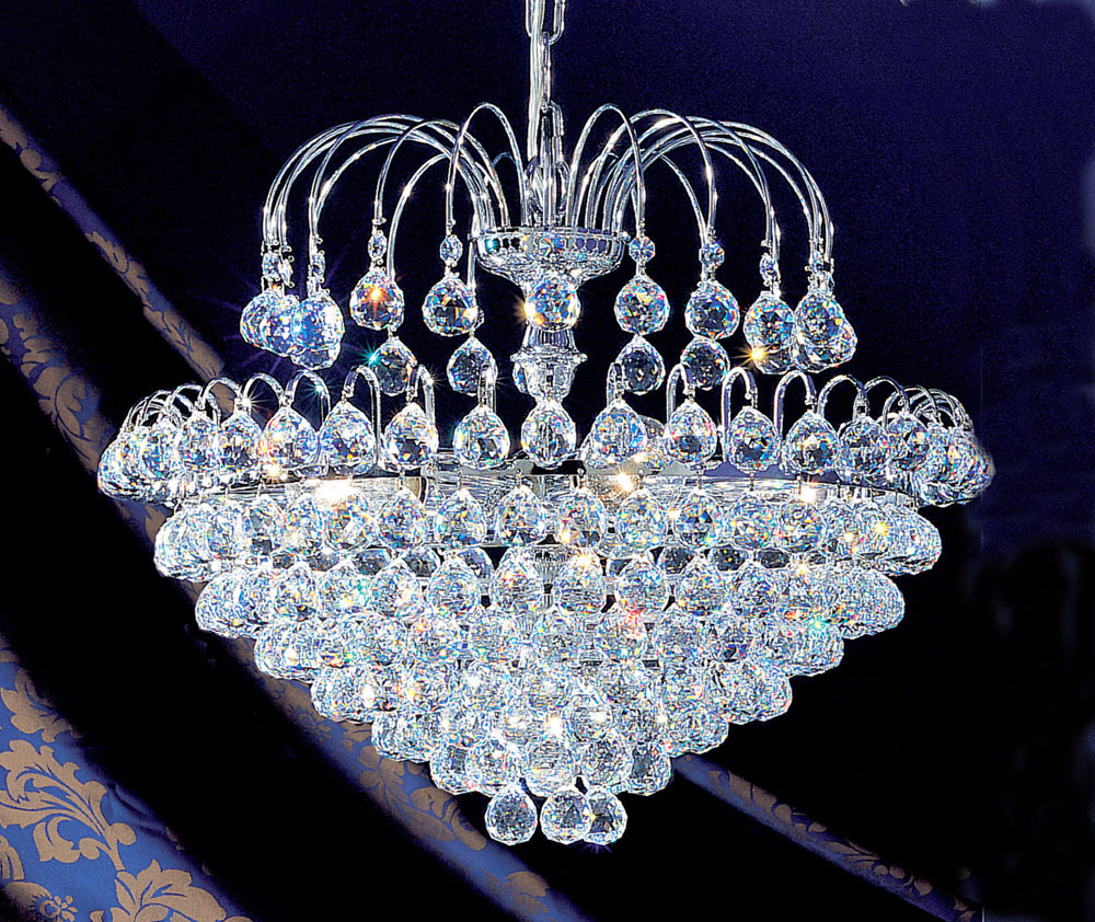 Diamante 23"Wide x 23"Long x 19"High Lights: 7 x 60W candelabra Finish Shown: Chrome Crystal Shown: Crystalique-Plus Chain or Cable Length: 3 Ship Via: Parcel Shipping Weight: 46 Hanging Weight: 40 Catalog/Page Ref: 5005/128 A contemporary look that will live forever