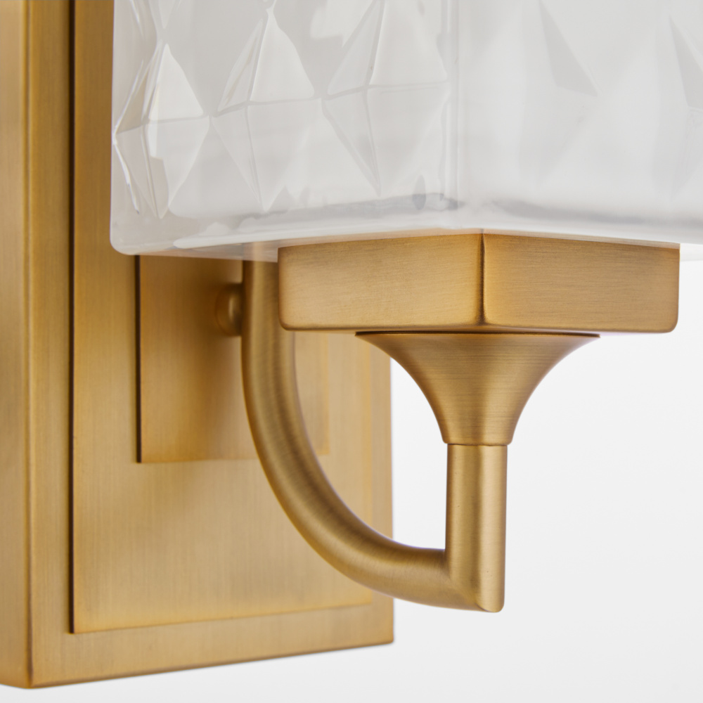 Diamonte’s striking square shade and elegant case glass offer a modern flair while illuminating spaces with a soft, radiant glow. The subtle detailing on the brushed brass backplate and arms enhances this collection with understated charm and character. Designed for versatility, its dual-mount application allows upward or downward installation to suit any space. Multiple light options are available.