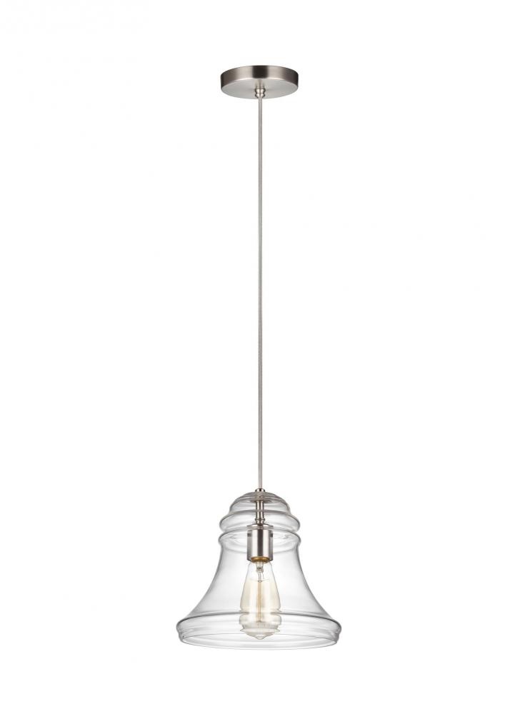 The Doyle one light mini pendant in satin nickel enhances the beauty of your home with ample light and style to match today's trends. The Doyle one-light mini pendant springs to life with the fine artistry and technique of hand-blown glass. Spindle-inspired Clear glass shades give dimension and character to these traditional pendant lights. Paired with Edison-style bulbs, this mini pendant is a period-inspired classic to complement a wide range of decor from Colonial to nautical to rich, European inspired settings. Available in two sizes and two hardware finishes, Oil Rubbed Bronze and Satin Nickel, Doyle mini pendants may be installed as single pendants or clustered in multiples using a Visual Comfort Studio Multi-Port canopy, which would be an ideal installation used for entry lighting, dining room lighting, living room lighting or kitchen lighting over a table.