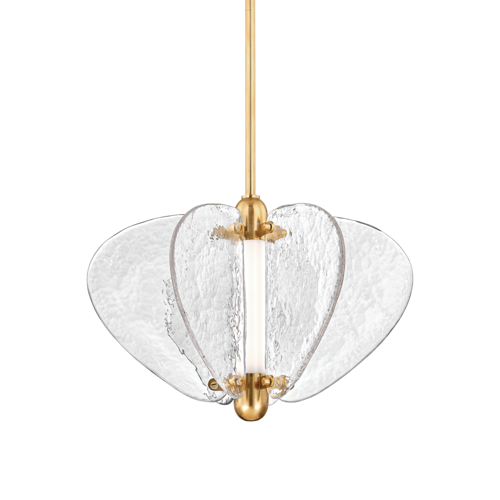 A frosty chill meets the warmth of LED in this sculptural pendant light. Resembling sheets of ice, four thin Piastra glass blades with chill marks extend from a central opal glossy glass core. A Vintage Brass framework provides a golden glow that enhances this pendant?s sparkle when lit.